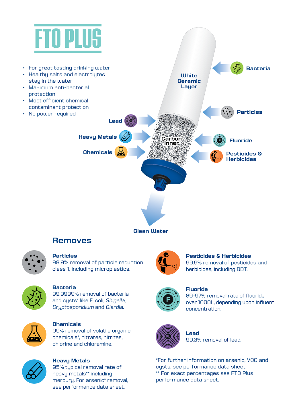 Les filtres Coldstream FTO+ utilisent une technologie avancée combinant céramique haute densité et charbon actif haute performance, garantissant une filtration optimale et constante.