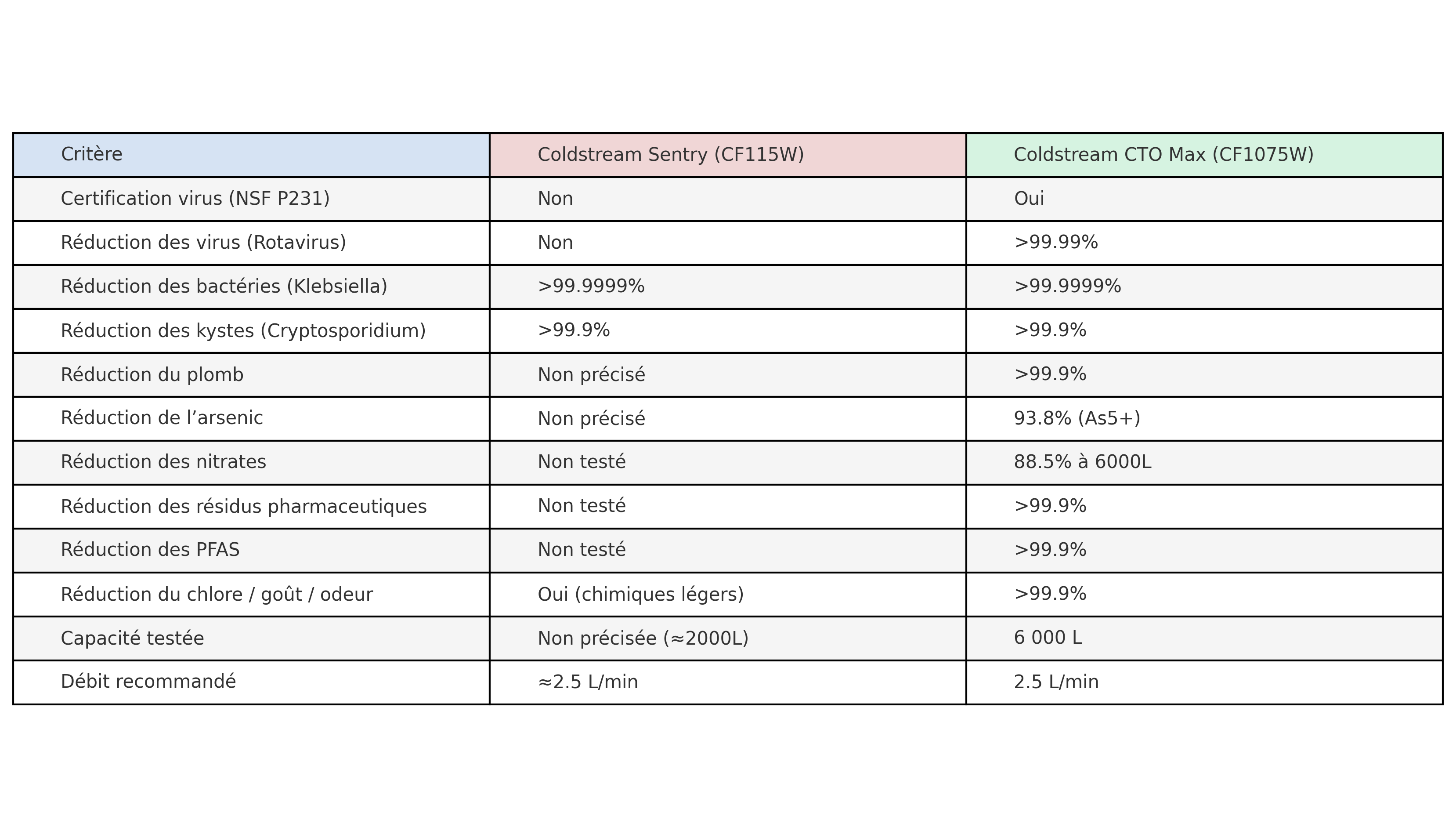 Le filtre Coldstream Sentry (CF115W) a été testé selon les normes NSF/ANSI 42, 53 et partiellement P231, avec des résultats démontrés pour la réduction des bactéries et des kystes.