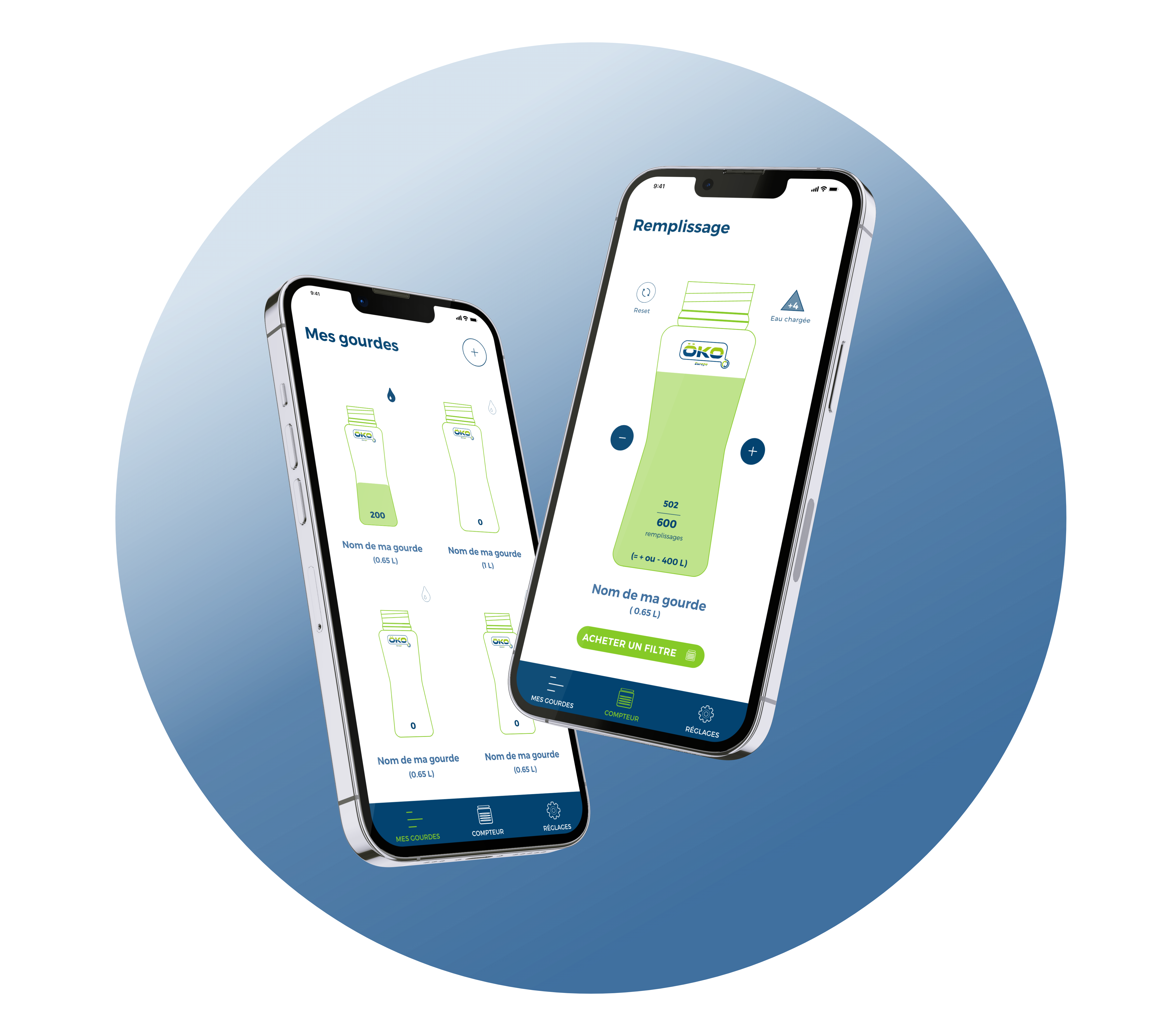Vous pouvez également utiliser l'application Öko, cette application vous aide à gérer votre utilisation quotidienne de la gourde afin de connaitre la quantité d'eau filtrée tout au long de son utilisation.