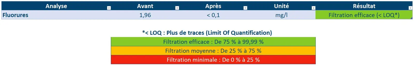 LES RESULTATS AVANT ET APRES FLUOR - Conditions du test : Eau du robinet avec ajout volontaire de 2mg/l de fluorures - Période : Aout 2023