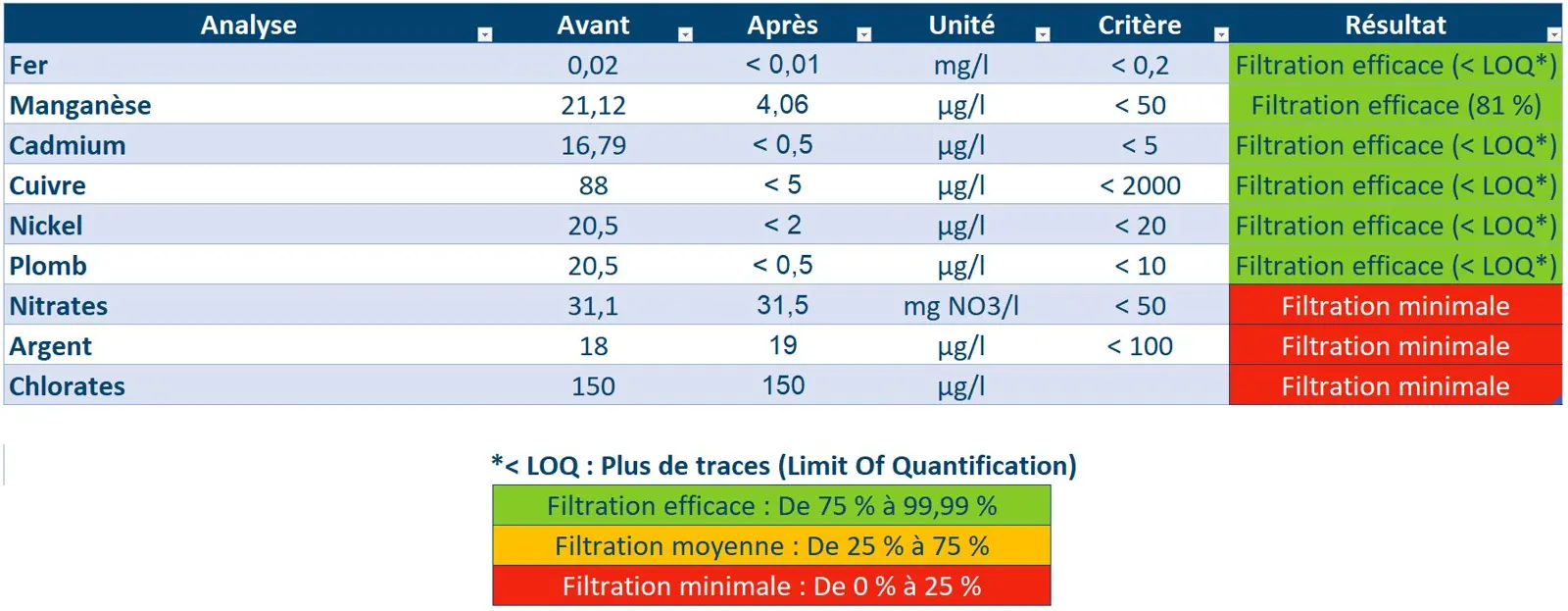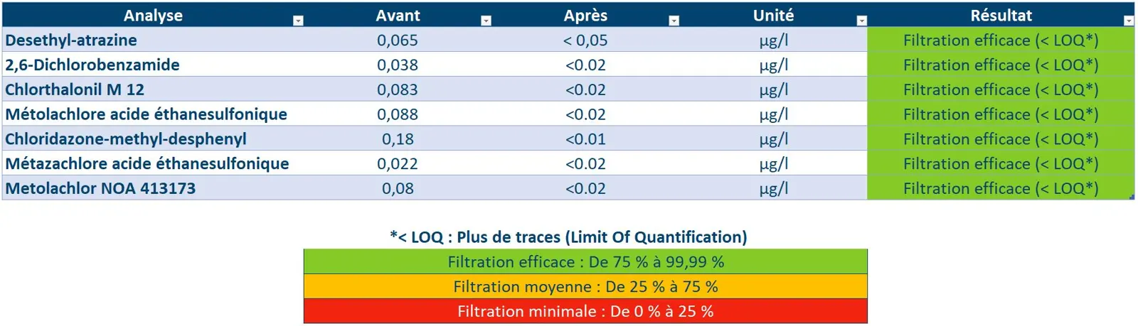 - Les tests en laboratoire Eurofins : capacités de filtration des pesticides, métabolites et métaux lourds.
